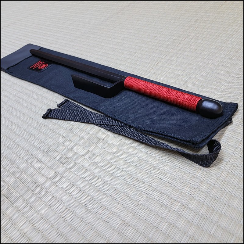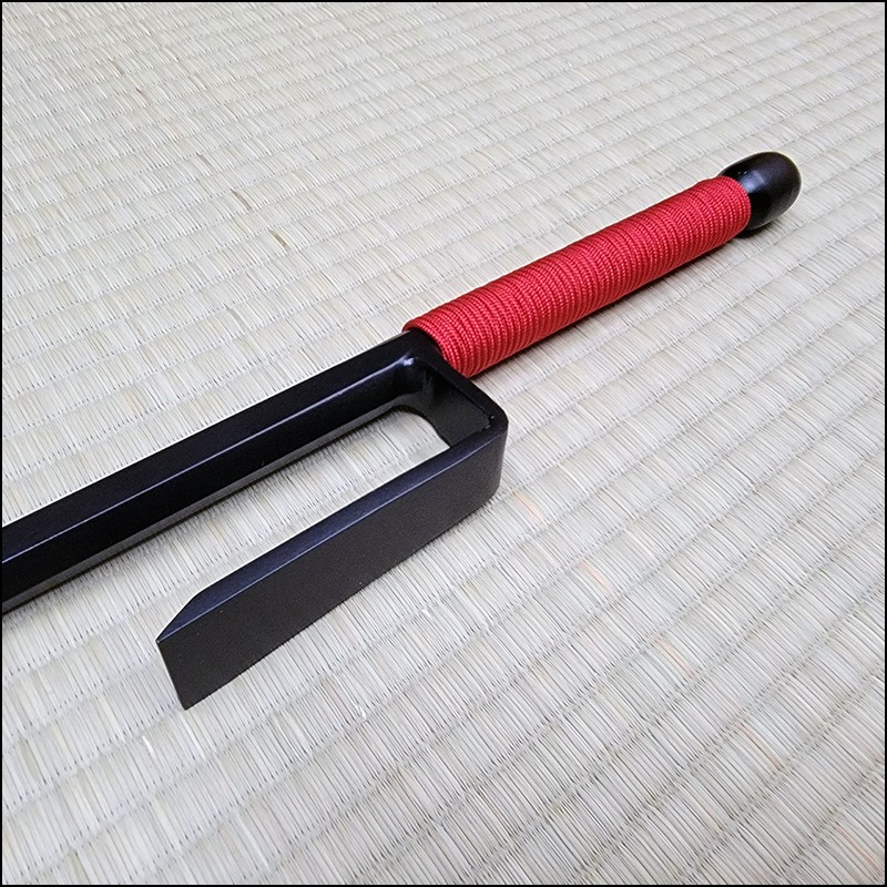 Traditional Japanese Jutte or Jitte specially designed for contact training. This Jutte model is characterized by having a hexagonal blade (monouchi) and rounded back (tsukagashira) made from wrought iron with black powder coating finish and red cord.
