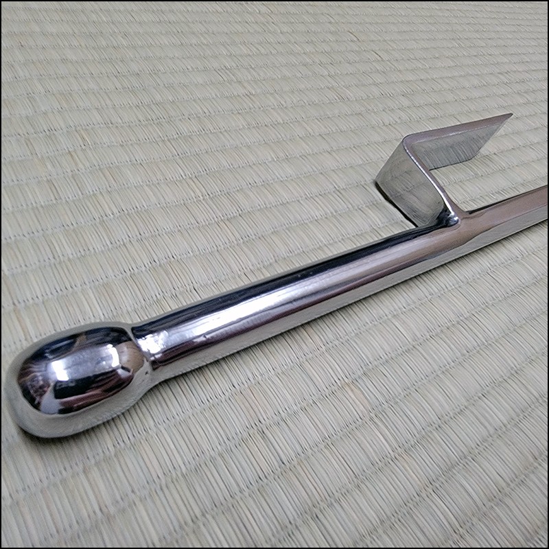 Traditional Japanese Jutte or Jitte specially designed for contact training. This Jutte model is characterized by having a hexagonal blade (monouchi) and rounded back (tsukagashira) made from wrought iron with polished finish and no cord.