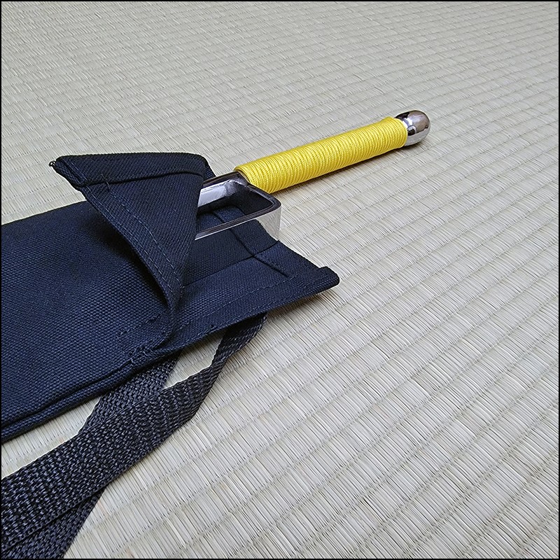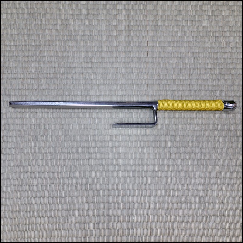 Traditional Japanese Jutte or Jitte specially designed for contact training. This Jutte model is characterized by having a hexagonal blade (monouchi) and rounded back (tsukagashira) made from wrought iron with polished finish and yellow cord.