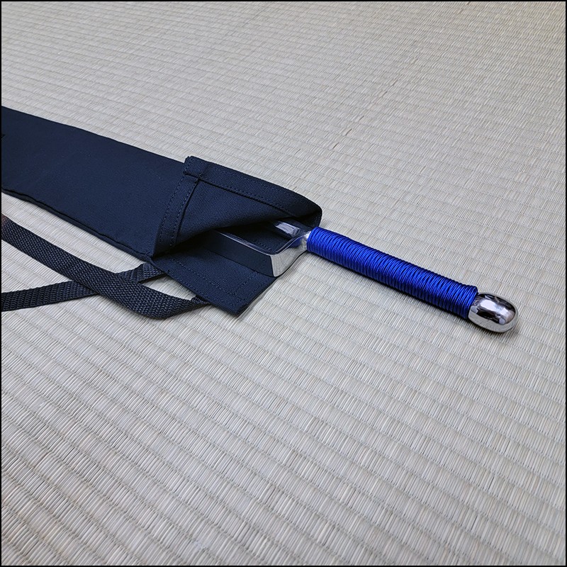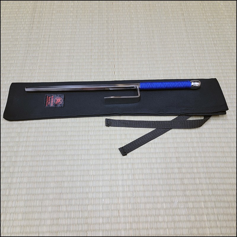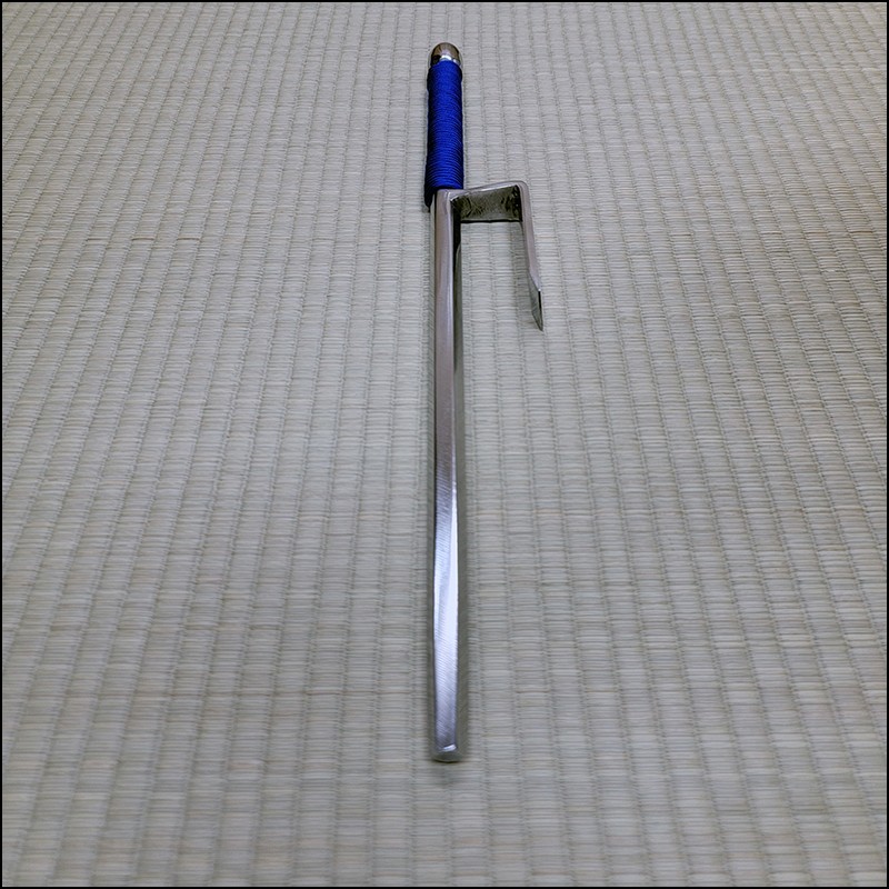 Traditional Japanese Jutte or Jitte specially designed for contact training. This Jutte model is characterized by having a hexagonal blade (monouchi) and rounded back (tsukagashira) made from stainless steel with polished finish and blue cord.