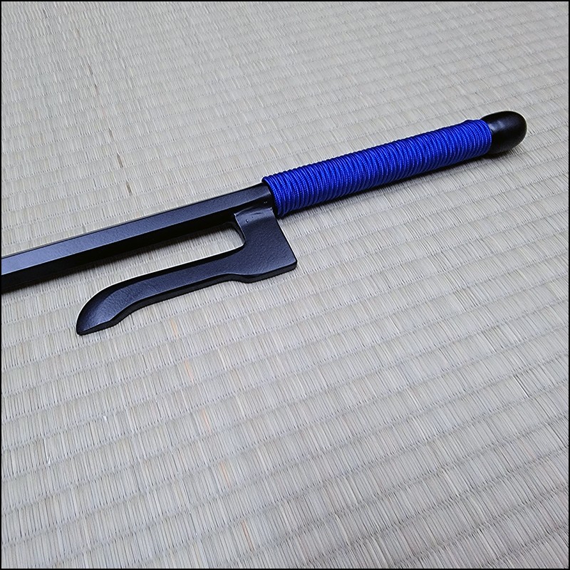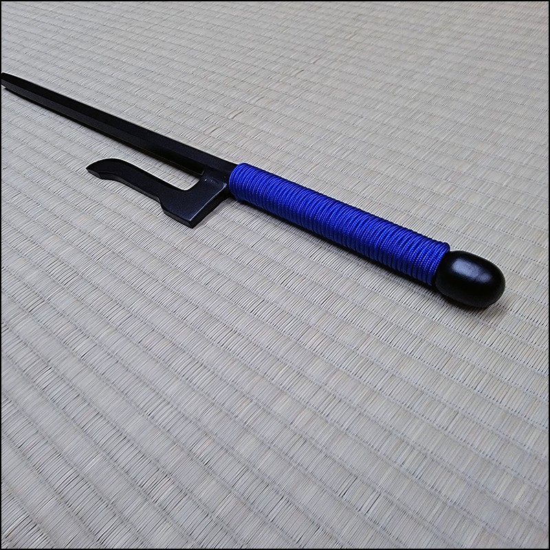 Jutte or Jitte – This single weapon has been especially designed for the proper practice within the Ikkaku Ryu Juttejutsu ryuha. This Jutte model is characterized by having a hexagonal blade (monouchi) and round back (tsukagashira) made from wrought iron with black powder coating finish and blue cord.