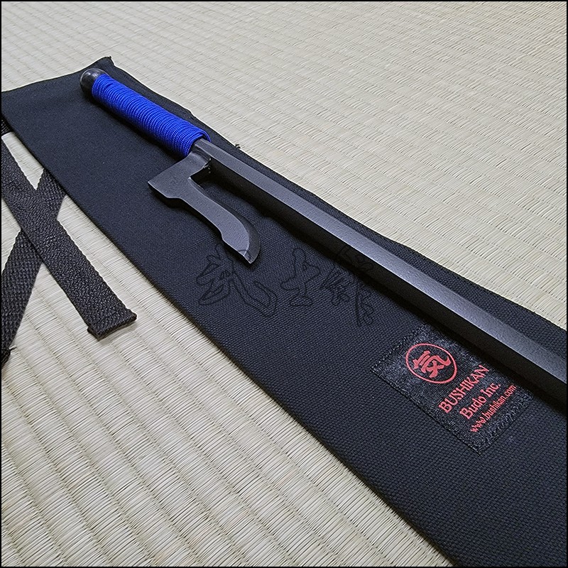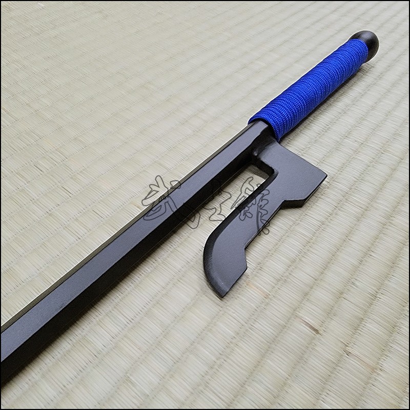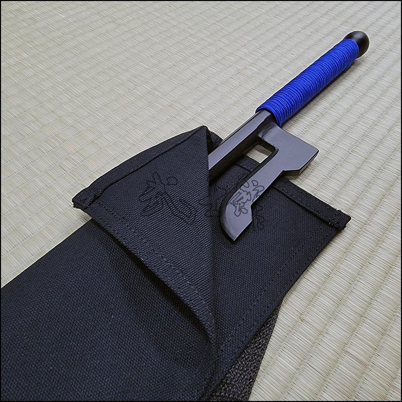 Jutte or Jitte – This single weapon has been especially designed for the proper practice within the Ikkaku Ryu Juttejutsu ryuha. This Jutte model is characterized by having a hexagonal blade (monouchi) and pointy back (tsukagashira) made from wrought iron with black powder coating finish and blue cord.
