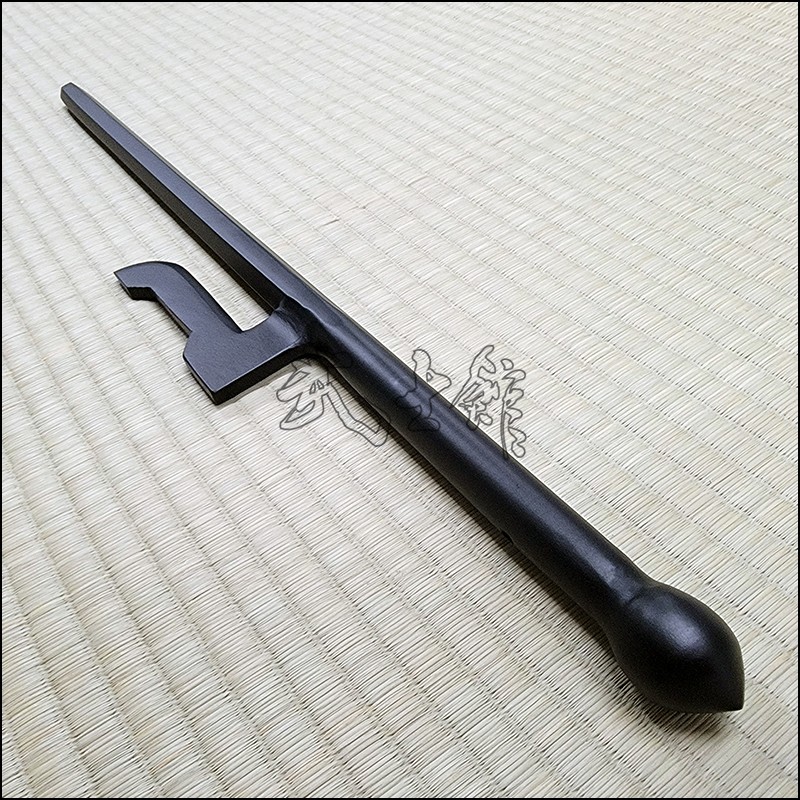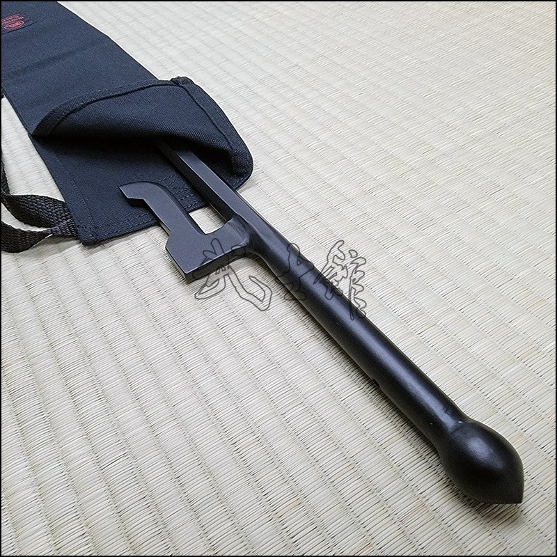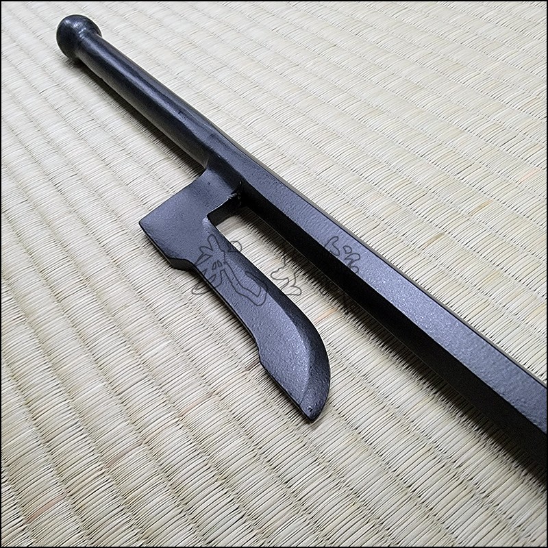 Jutte or Jitte – This single weapon has been especially designed for the proper practice within the Ikkaku Ryu Juttejutsu ryuha. This Jutte model is characterized by having a hexagonal blade (monouchi) and pointy back (tsukagashira) made from wrought iron with black powder coating finish and no cord.