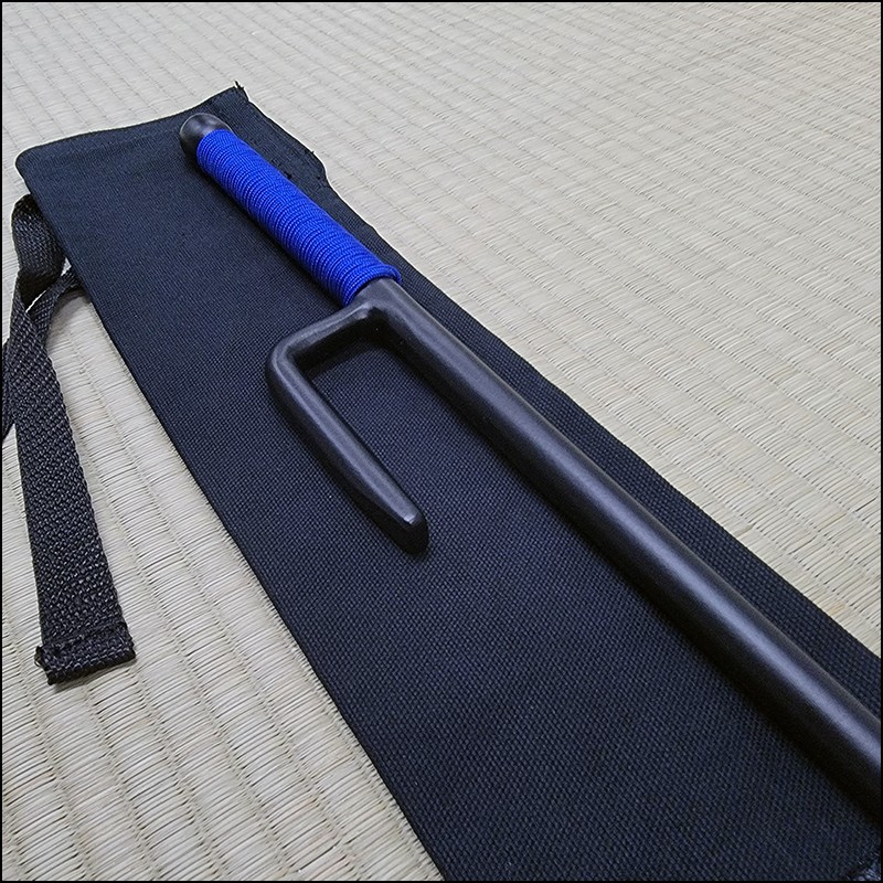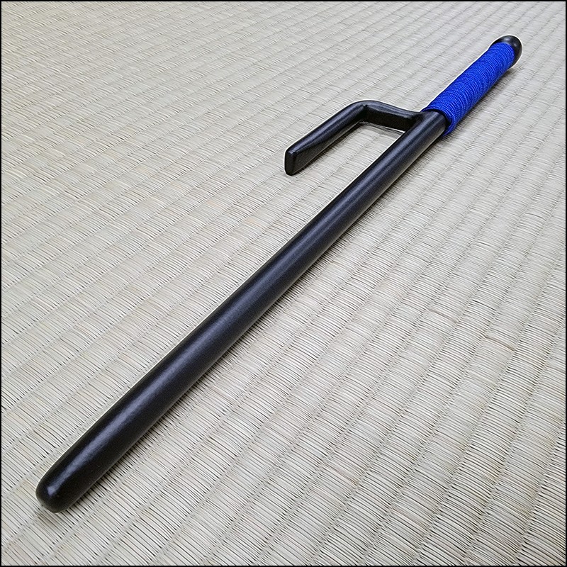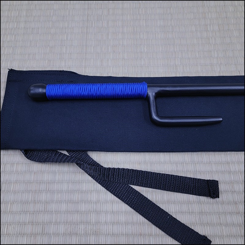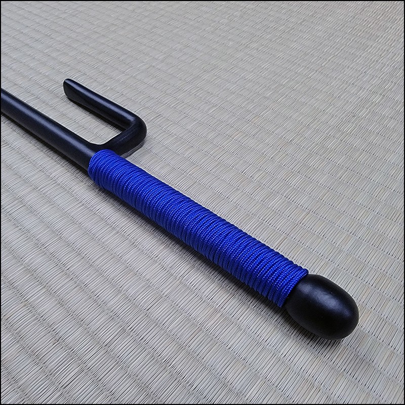 Jutte or Jitte – This single weapon has been especially designed for the practice against a bokken. This Jutte model is characterized by having a round blade (monouchi), round guard (yoku) and round back (tsukagashira) made from wrought iron with black powder coating finish and blue cord. The round monouchi and round yoku design is to minimize the damage to a bokken during contact practice.