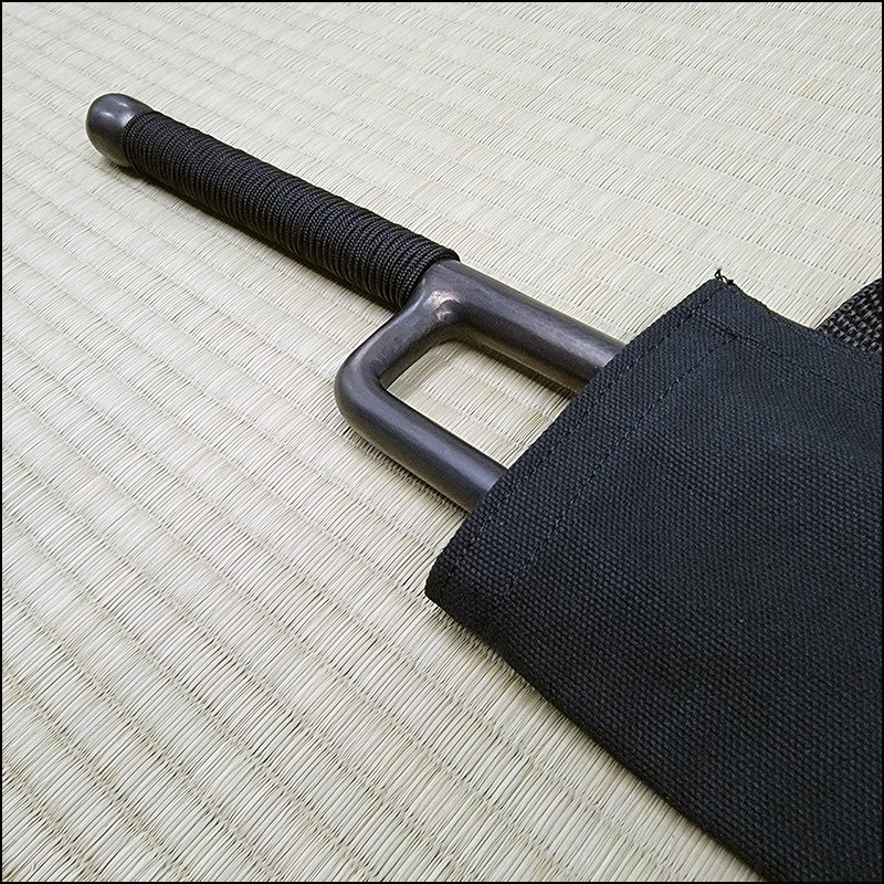 Jutte or Jitte – This single weapon has been especially designed for the practice against a bokken. This Jutte model is characterized by having a round blade (monouchi), round guard (yoku) and round back (tsukagashira) made from wrought iron with natural finish and black cord. The round monouchi and round yoku design is to minimize the damage to a bokken during contact practice.