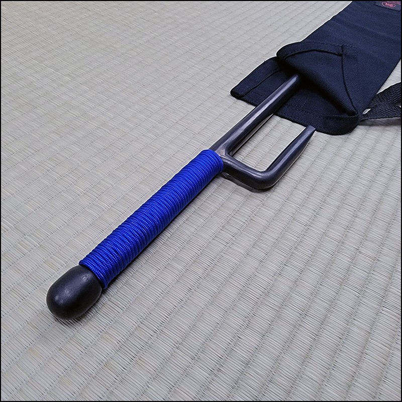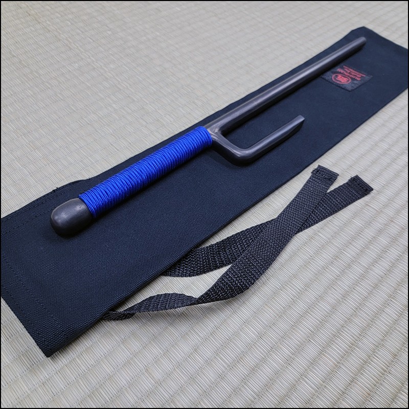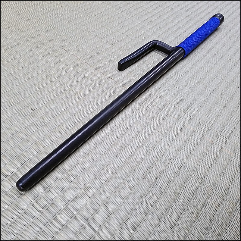 Jutte or Jitte – This single weapon has been especially designed for the practice against a bokken. This Jutte model is characterized by having a round blade (monouchi), round guard (yoku) and round back (tsukagashira) made from wrought iron with natural finish and blue cord. The round monouchi and round yoku design is to minimize the damage to a bokken during contact practice.