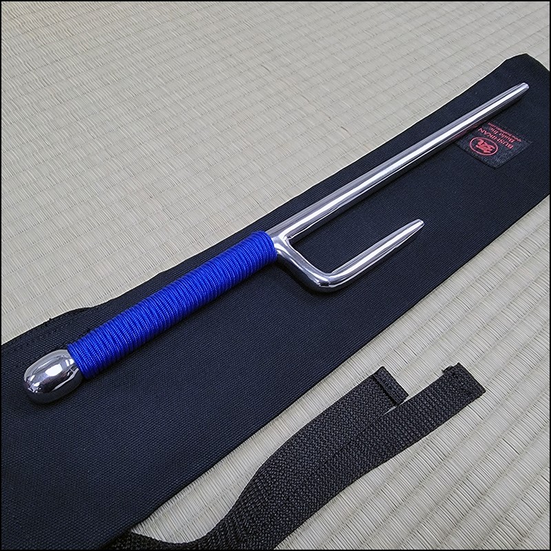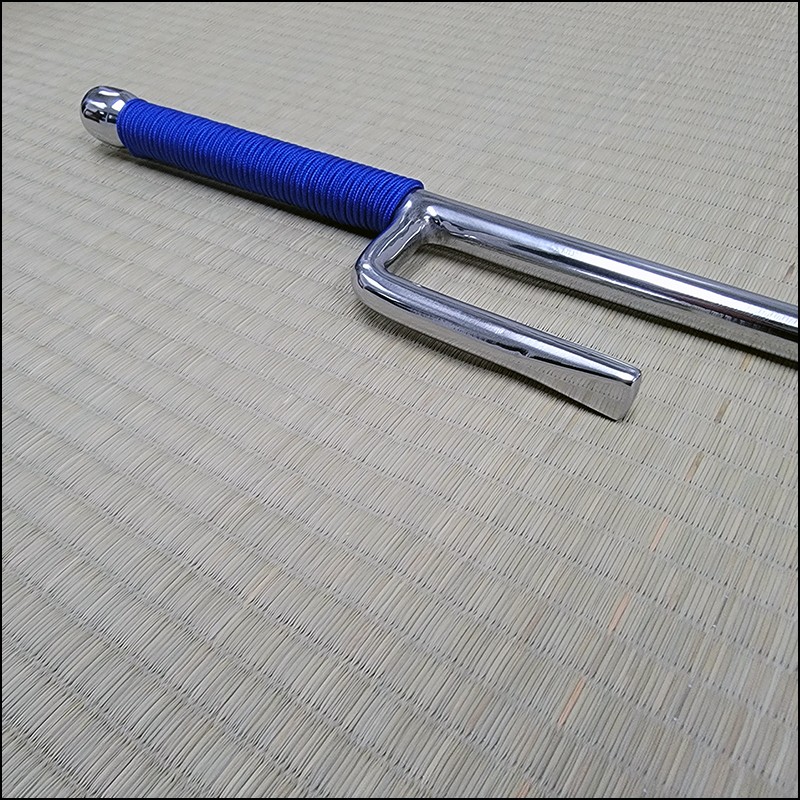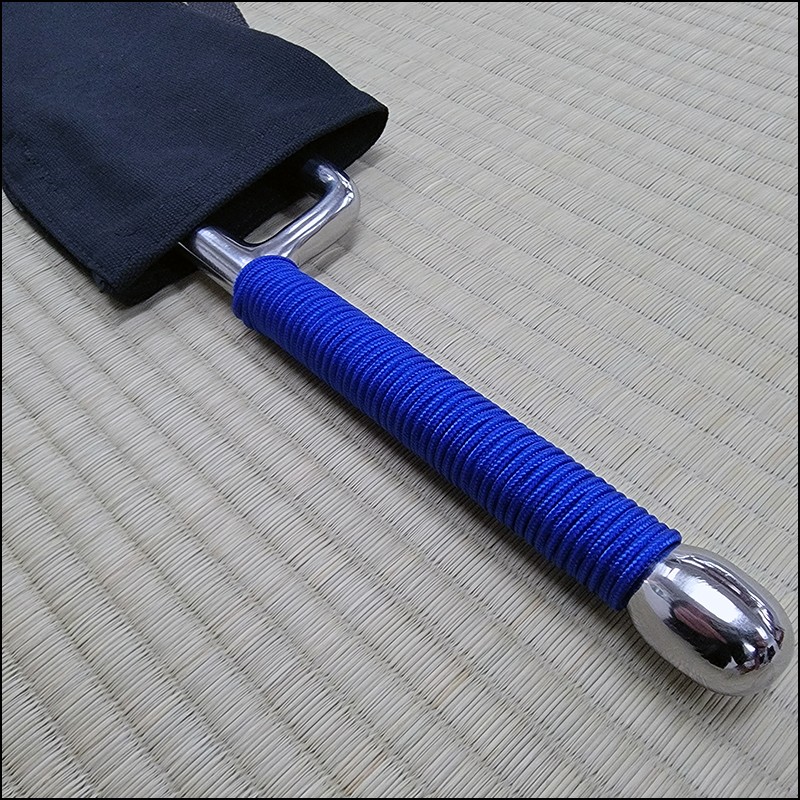 Jutte or Jitte – This single weapon has been especially designed for the practice against a bokken. This Jutte model is characterized by having a round blade (monouchi), round guard (yoku) and round back (tsukagashira) made from wrought iron with polished finish and blue cord. The round monouchi and round yoku design is to minimize the damage to a bokken during contact practice.