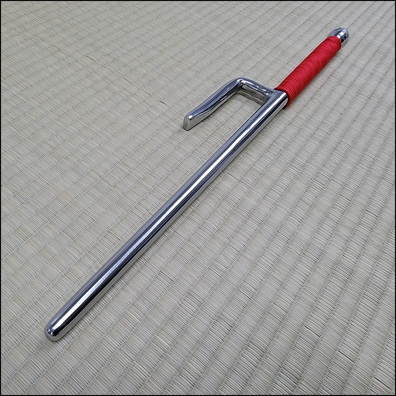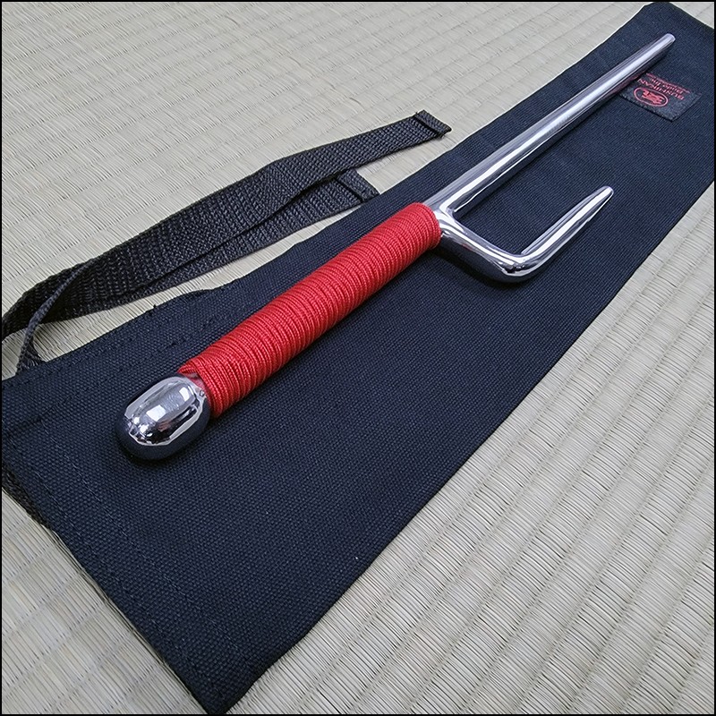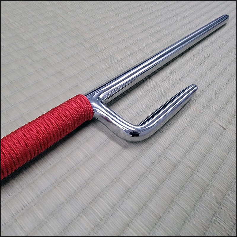 Jutte or Jitte – This single weapon has been especially designed for the practice against a bokken. This Jutte model is characterized by having a round blade (monouchi), round guard (yoku) and round back (tsukagashira) made from stainless steel with polished finish and red cord. The round monouchi and round yoku design is to minimize the damage to a bokken during contact practice.