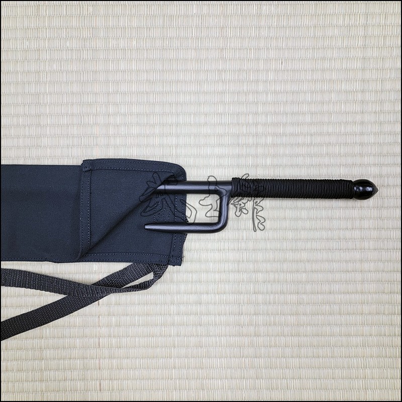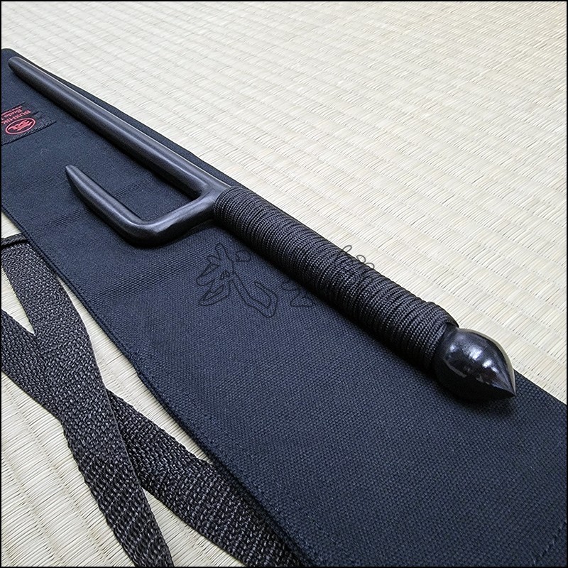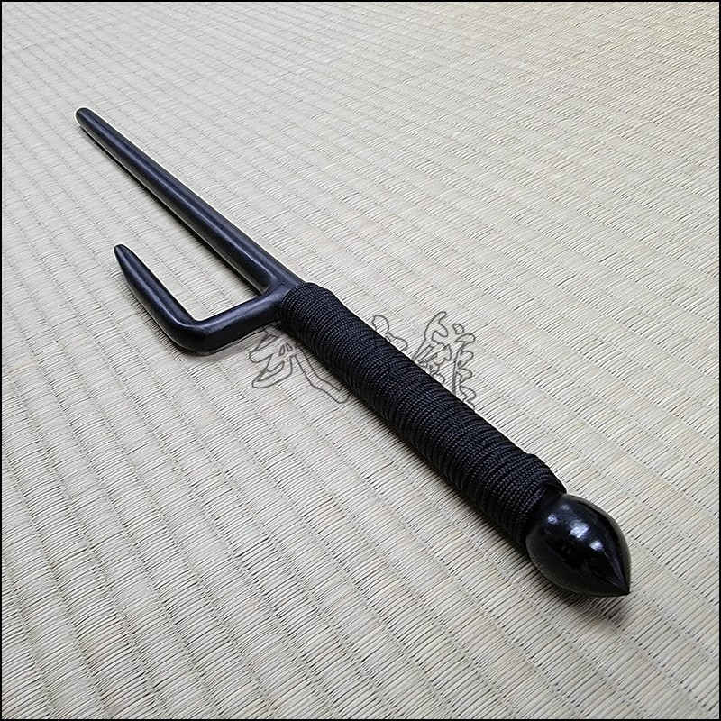 Jutte or Jitte – This single weapon has been especially designed for the practice against a bokken. This Jutte model is characterized by having a round blade (monouchi), round guard (yoku) and pointy back (tsukagashira) made from wrought iron with black powder coating finish and black cord. The round monouchi and round yoku design is to minimize the damage to a bokken during contact practice.