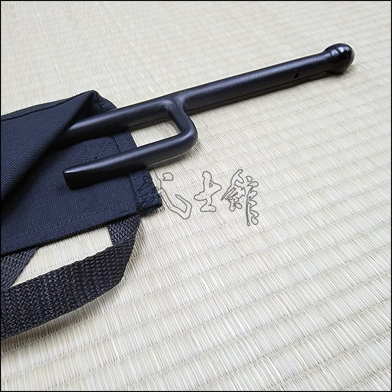 Jutte or Jitte – This single weapon has been especially designed for the practice against a bokken. This Jutte model is characterized by having a round blade (monouchi), round guard (yoku) and pointy back (tsukagashira) made from wrought iron with black powder coating finish and no cord. The round monouchi and round yoku design is to minimize the damage to a bokken during contact practice.