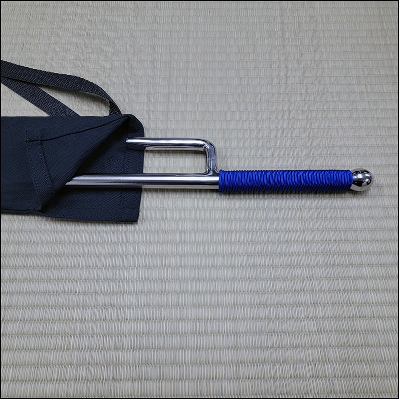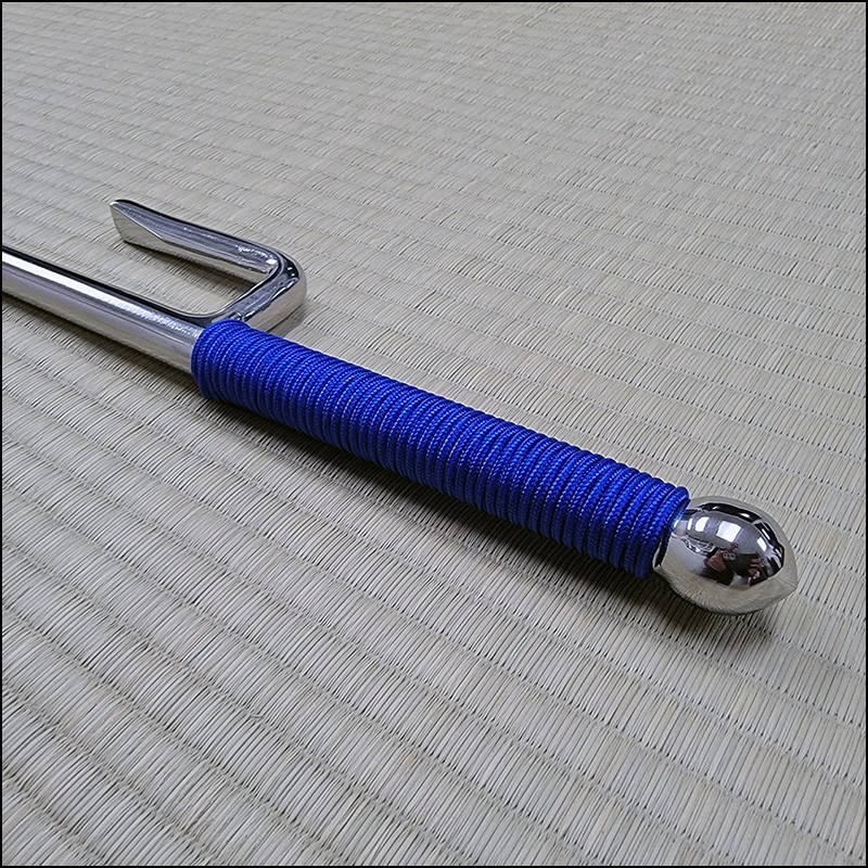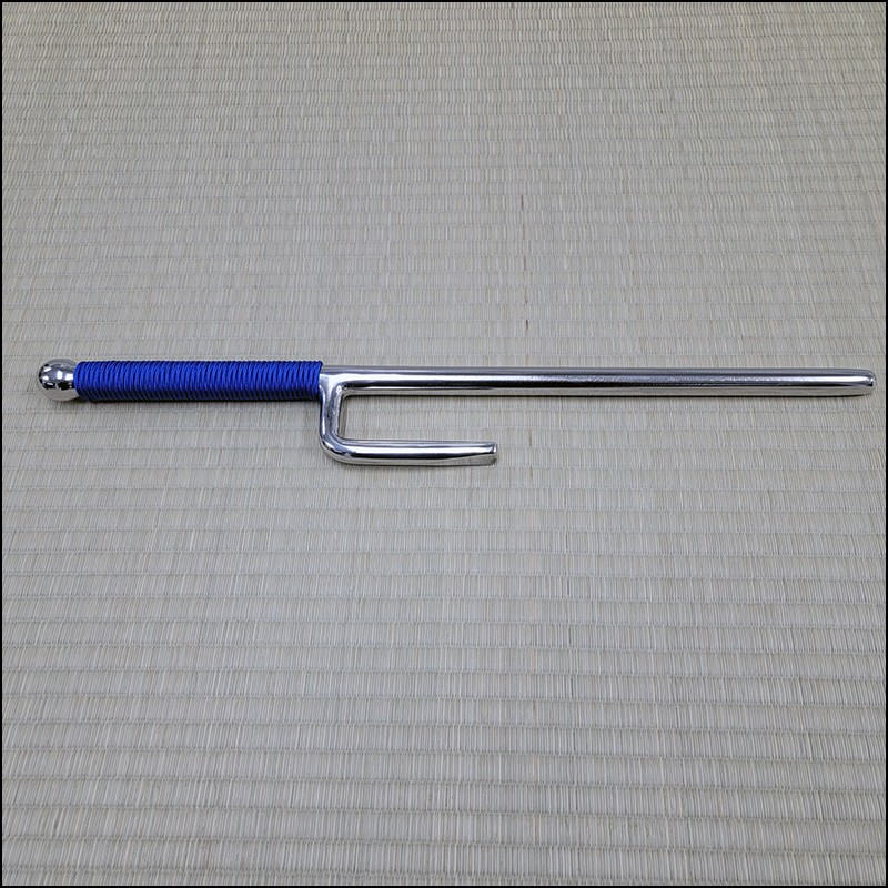 Jutte or Jitte – This single weapon has been especially designed for the practice against a bokken. This Jutte model is characterized by having a round blade (monouchi), round guard (yoku) and pointy back (tsukagashira) made from wrought iron with polished finish and blue cord. The round monouchi and round yoku design is to minimize the damage to a bokken during contact practice.
