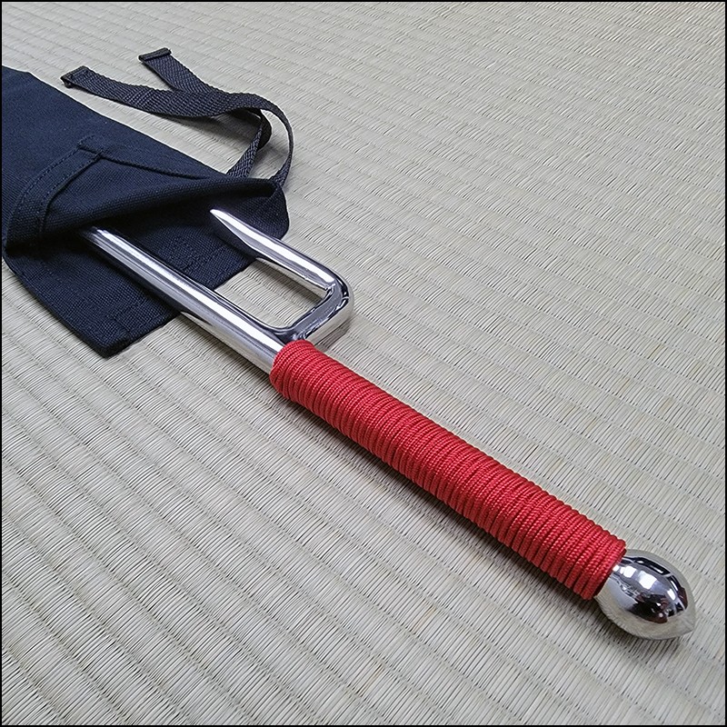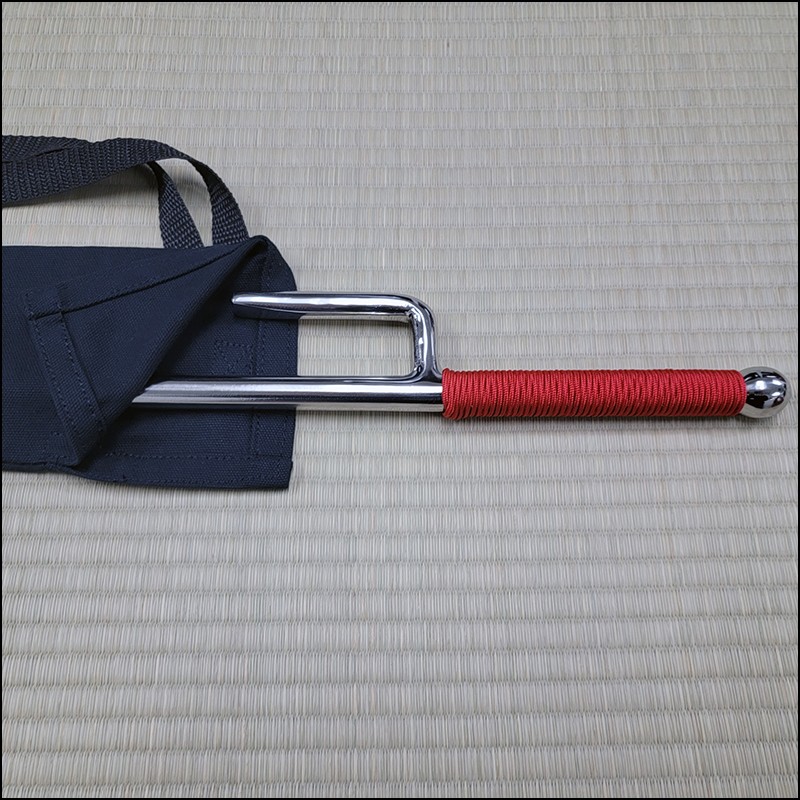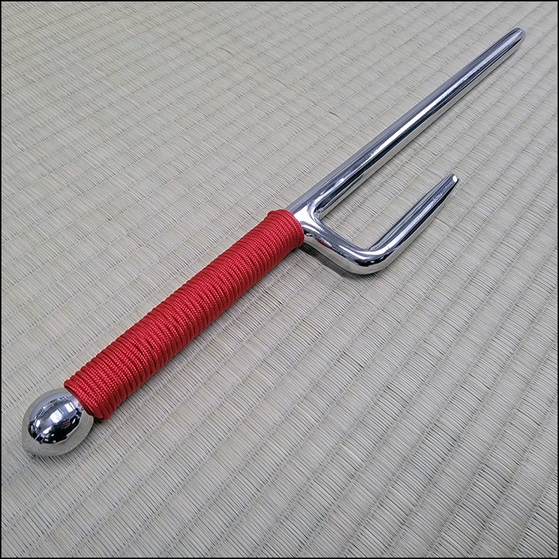 Jutte or Jitte – This single weapon has been especially designed for the practice against a bokken. This Jutte model is characterized by having a round blade (monouchi), round guard (yoku) and pointy back (tsukagashira) made from wrought iron with polished finish and red cord. The round monouchi and round yoku design is to minimize the damage to a bokken during contact practice.