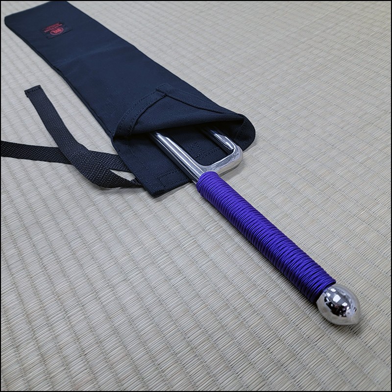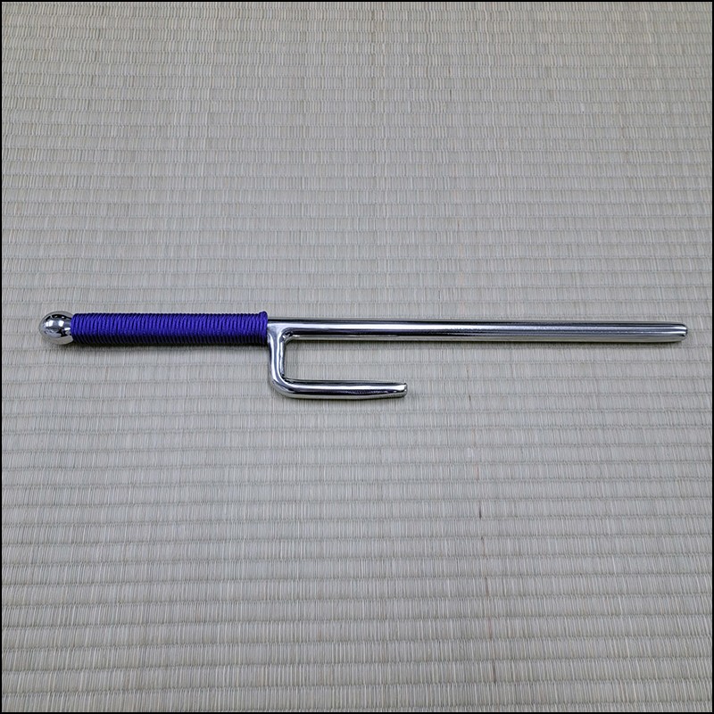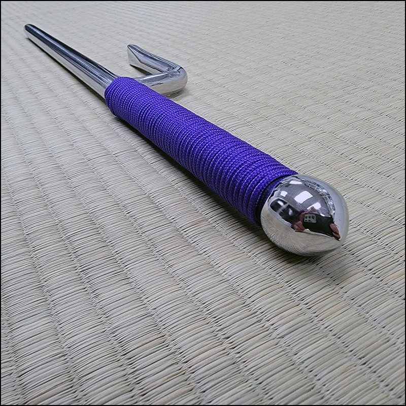 Jutte or Jitte – This single weapon has been especially designed for the practice against a bokken. This Jutte model is characterized by having a round blade (monouchi), round guard (yoku) and pointy back (tsukagashira) made from stainless steel with polished finish and purple cord. The round monouchi and round yoku design is to minimize the damage to a bokken during contact practice.
