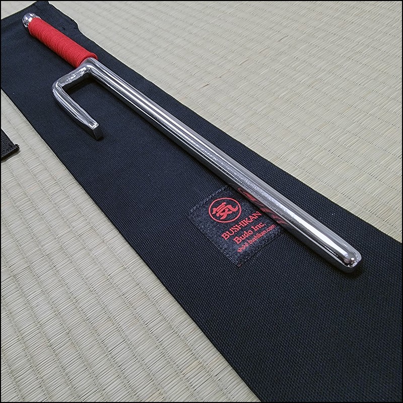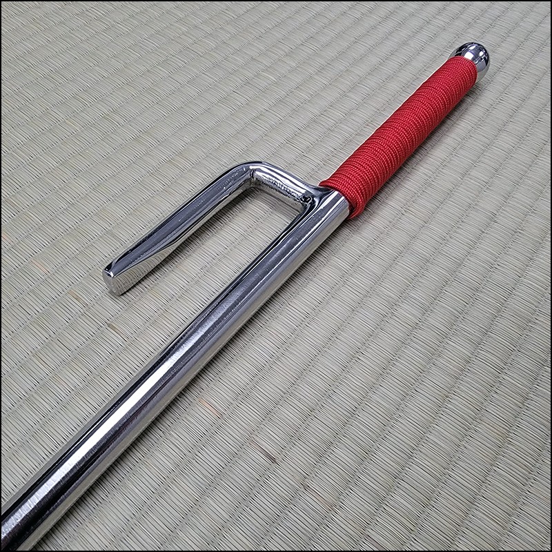 Jutte or Jitte – This single weapon has been especially designed for the practice against a bokken. This Jutte model is characterized by having a round blade (monouchi), round guard (yoku) and pointy back (tsukagashira) made from stainless steel with polished finish and red cord. The round monouchi and round yoku design is to minimize the damage to a bokken during contact practice.