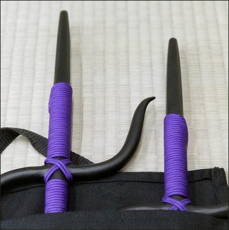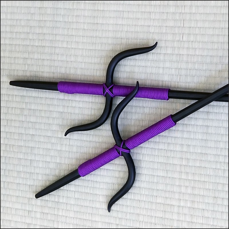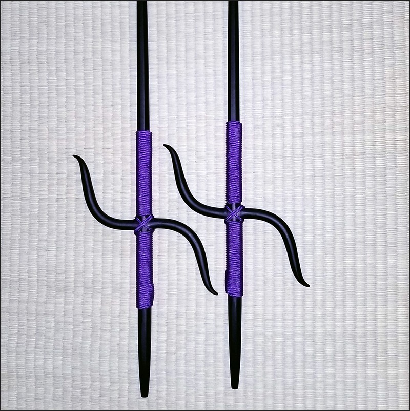 Manji Sai 1 – Bushikan traditional kobudo Manji Sai with black powder coating finish and purple cord made from wrought iron.