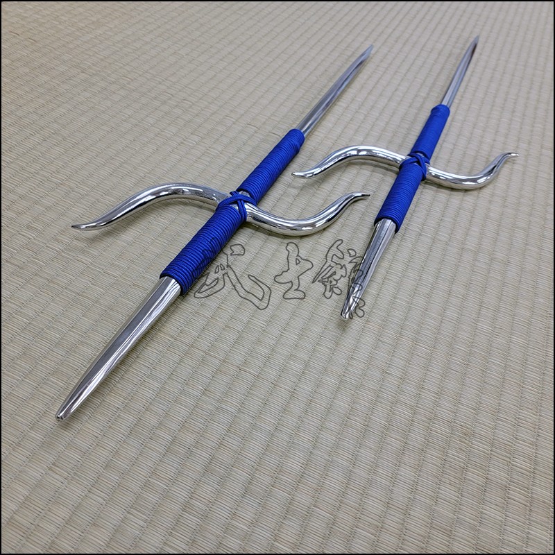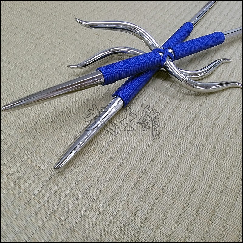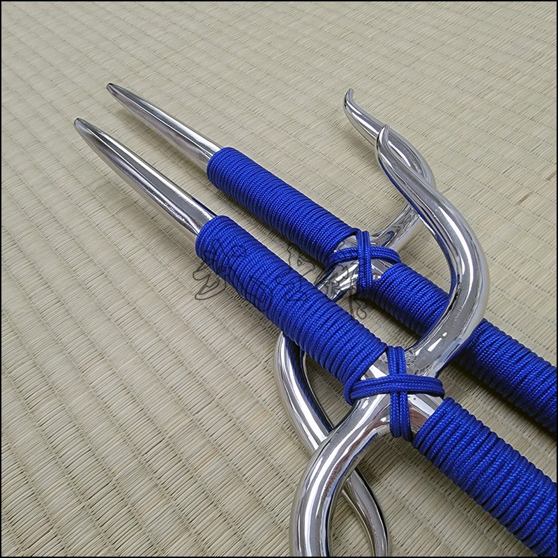 Manji Sai 1 – Bushikan traditional kobudo Manji Sai with polished finish and blue cord made from stainless steel.