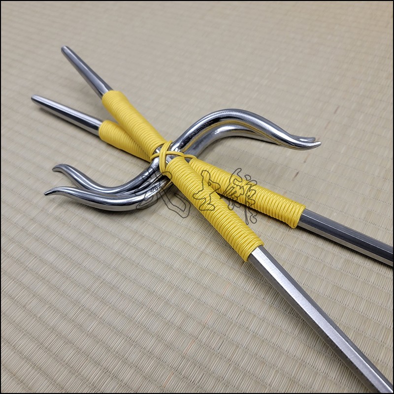 Manji Sai 1 – Bushikan traditional kobudo Manji Sai with polished finish and yellow cord made from stainless steel.