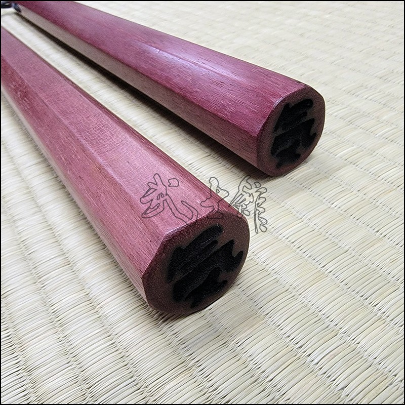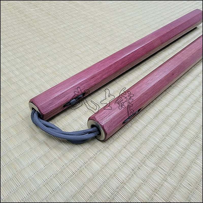 Nunchaku – Traditional Kobudo weapon made from Purpleheart wood designed and handcrafted for contact training. Photos show sample of grey cord.