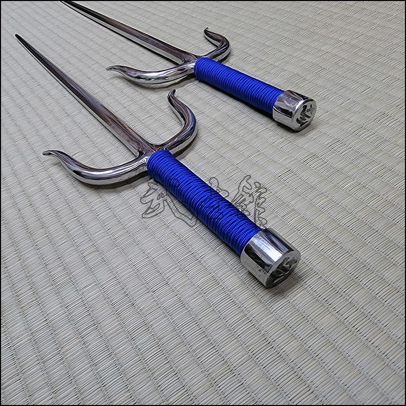 Sai 1 – Bushikan traditional kobudo Sai with polished finish and blue cord made from stainless steel. This Sai model is characterized by having an octagonal blade (monouchi) and flat back (tsukagashira).