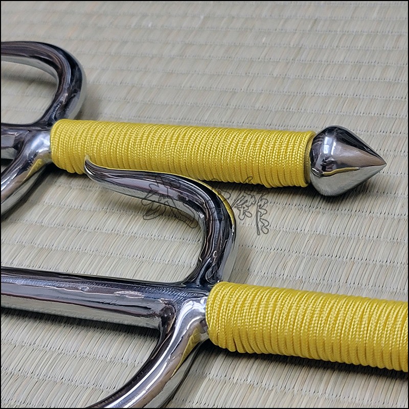 Sai 3 – Special traditional kobudo Sai with polished finish and yellow cord made from wrought iron. This Sai model is characterized by having a rounded blade (monouchi) and pointy back (tsukagashira).