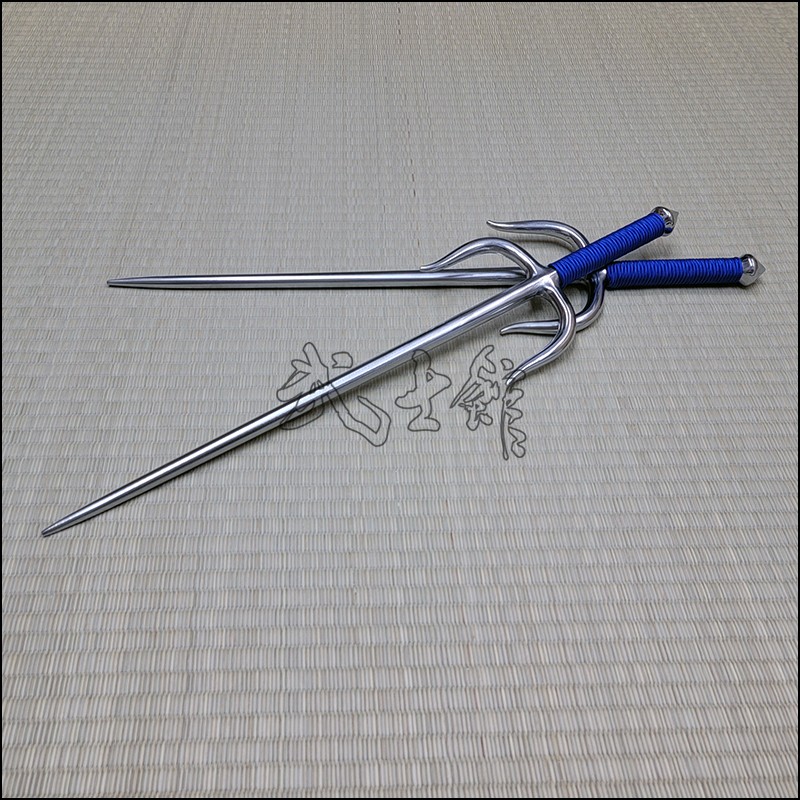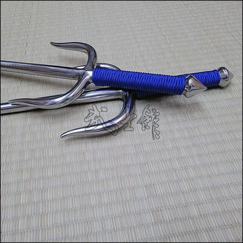 Sai 4 – Sai model used by Oyata Kobudo practitioners with polished finish and blue cord made from wrought iron. This Sai model is characterized by having a round blade (monouchi) and pointy back (tsukagashira).
