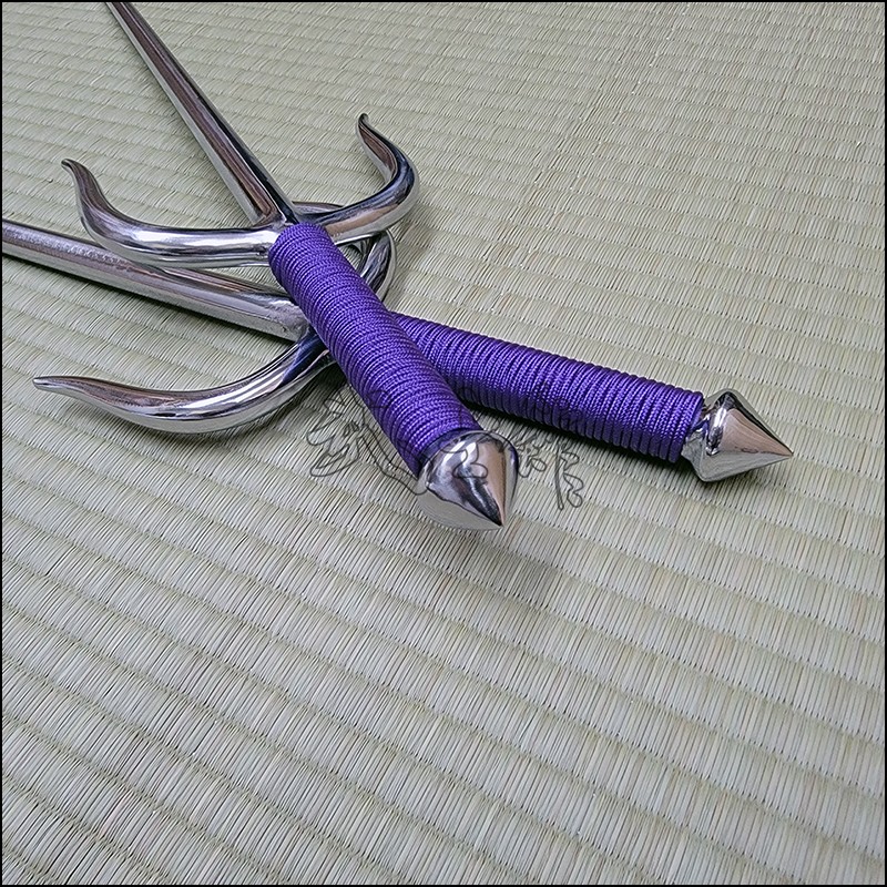 Sai 4 – Sai model used by Oyata Kobudo practitioners with polished finish and purple cord made from wrought iron. This Sai model is characterized by having a round blade (monouchi) and pointy back (tsukagashira).
