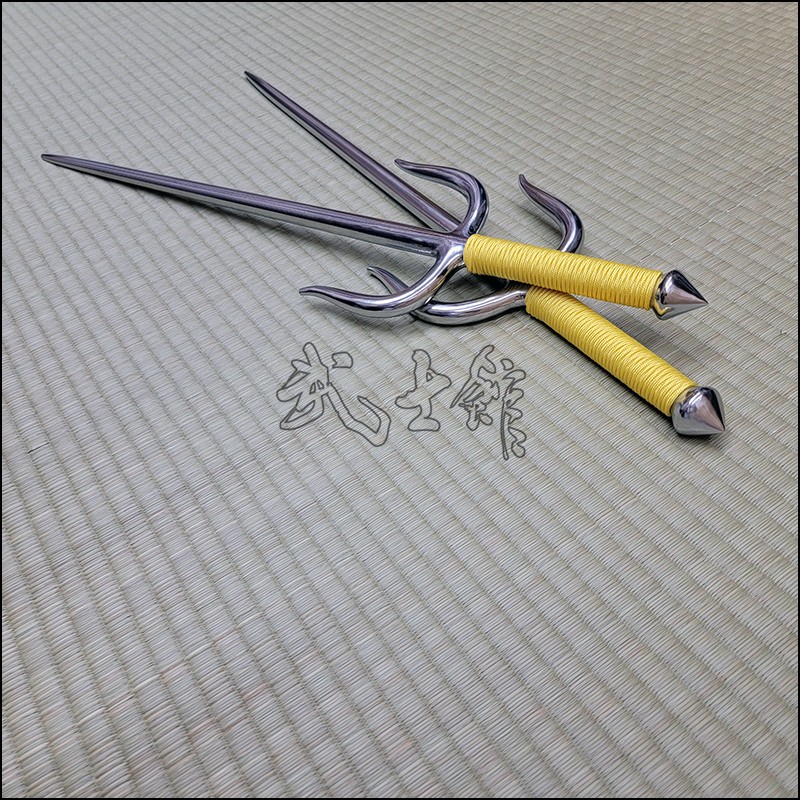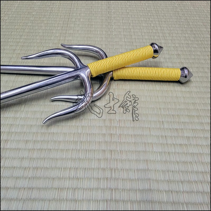 Sai 4 – Sai model used by Oyata Kobudo practitioners with polished finish and yellow cord made from stainless steel. This Sai model is characterized by having a round blade (monouchi) and pointy back (tsukagashira).