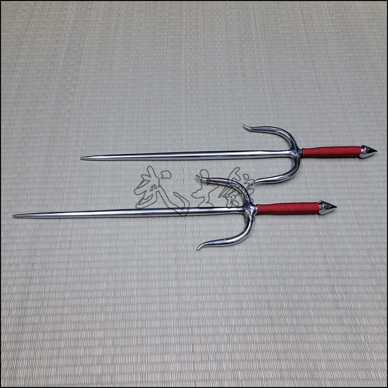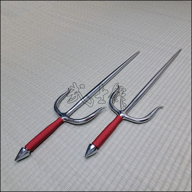 Sai 5 – Sai model used by Oyata Kobudo practitioners with polished finish and red cord made from wrought iron. This Sai model is characterized by having a thinner area before and after the moto (intersection of guards or yoku) for balance. This Sai model also has a round blade (monouchi) and pointy back (tsukagashira).