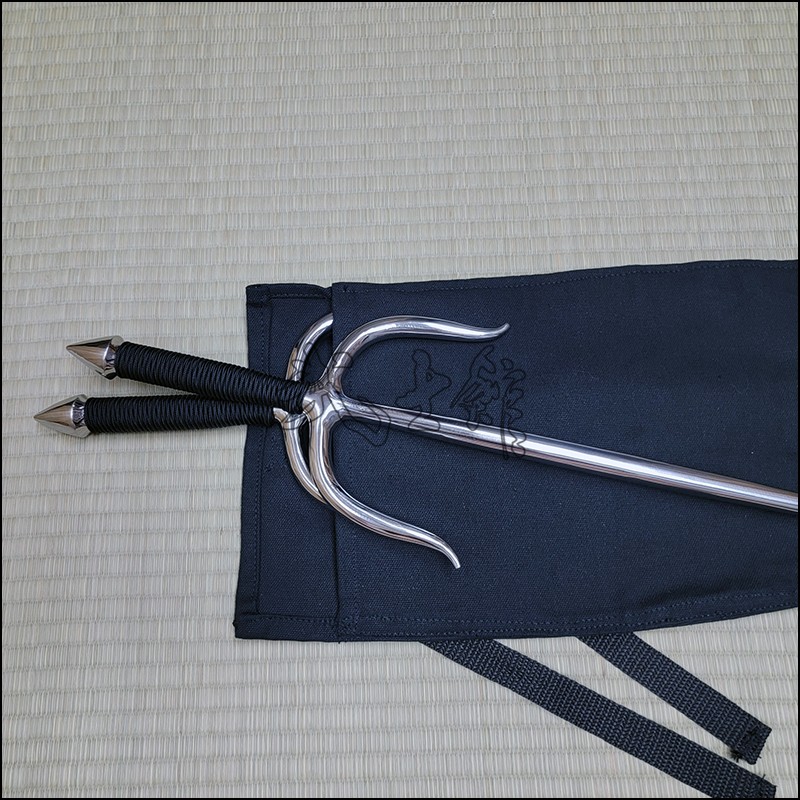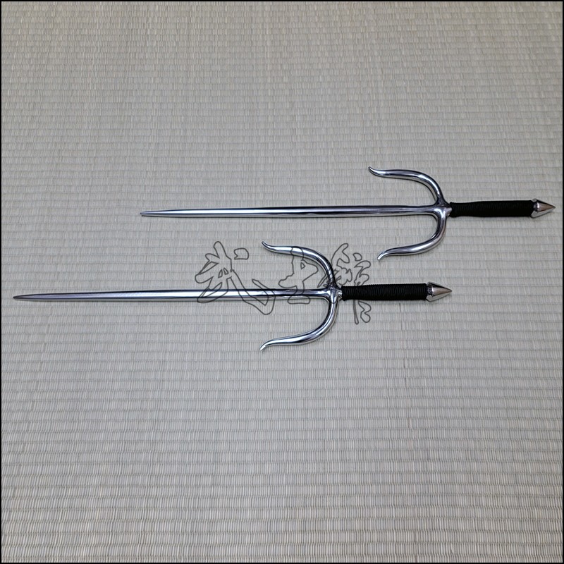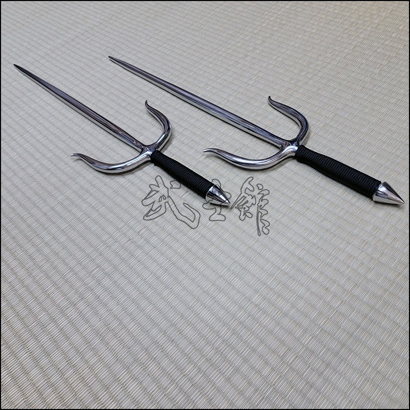 Sai 5 – Sai model used by Oyata Kobudo practitioners with polished finish and black cord made from stainless steel. This Sai model is characterized by having a thinner area before and after the moto (intersection of guards or yoku) for balance. This Sai model also has a round blade (monouchi) and pointy back (tsukagashira).