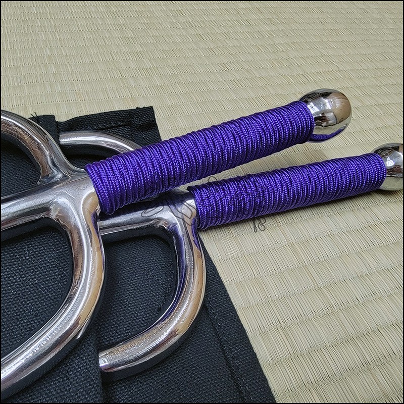 Sai 6 – Sai model used by Oyata Kobudo practitioners with polished finish and purple cord made from wrought iron. This Sai model is characterized by having a round blade (monouchi) and round back (tsukagashira).