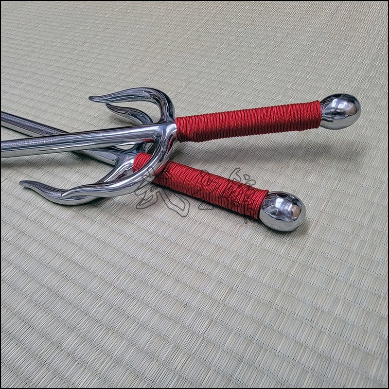 Sai 6 – Sai model used by Oyata Kobudo practitioners with polished finish and red cord made from wrought iron. This Sai model is characterized by having a round blade (monouchi) and round back (tsukagashira).