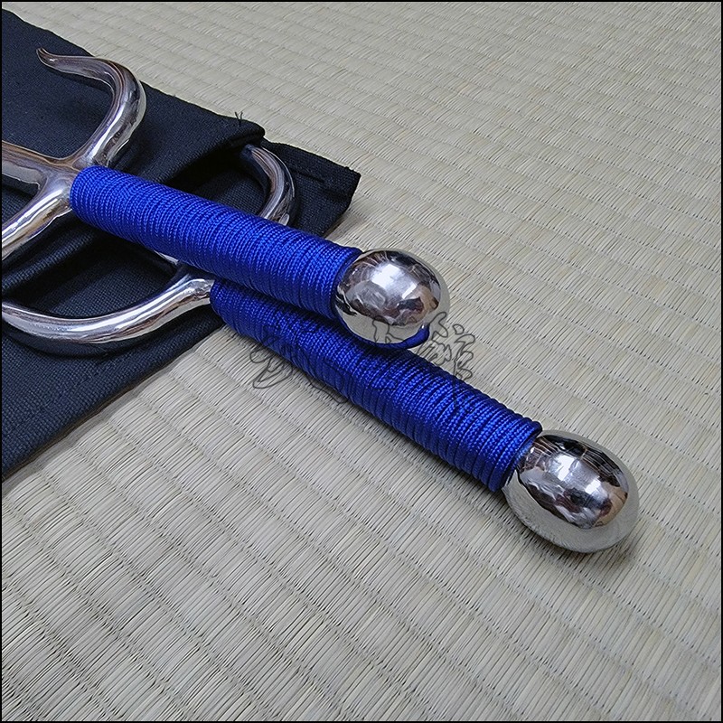 Sai 6 – Sai model used by Oyata Kobudo practitioners with polished finish and blue cord made from stainless steel. This Sai model is characterized by having a round blade (monouchi) and round back (tsukagashira).