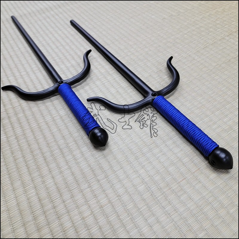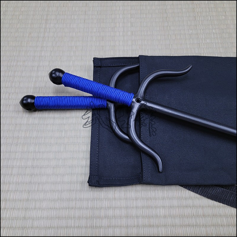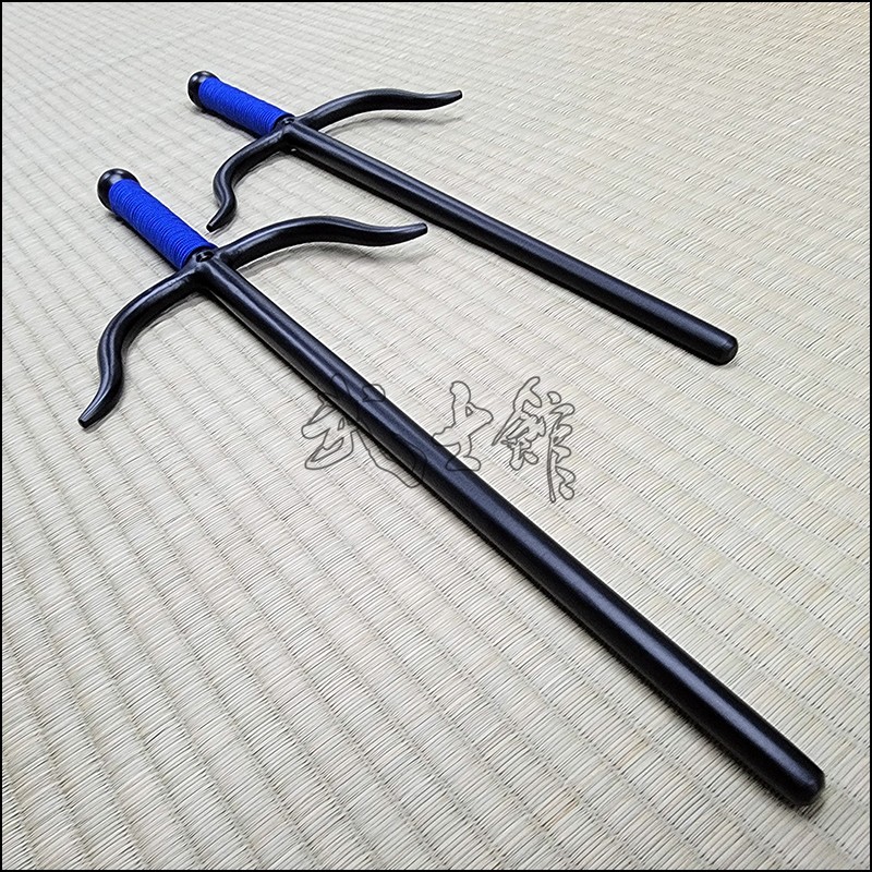 Sai 7 – Bushikan Chinese Sai (Tai) specially crafted for the Won Hop Loong Chuan martial arts organization with black powder coating finish and blue cord made from wrought iron. This Sai model is characterized by its very special guards (yoku), rounded blade (monouchi) and pointed back (tsukagashira). Sai-7 is sold in sets of 2 (pair of Sai).
