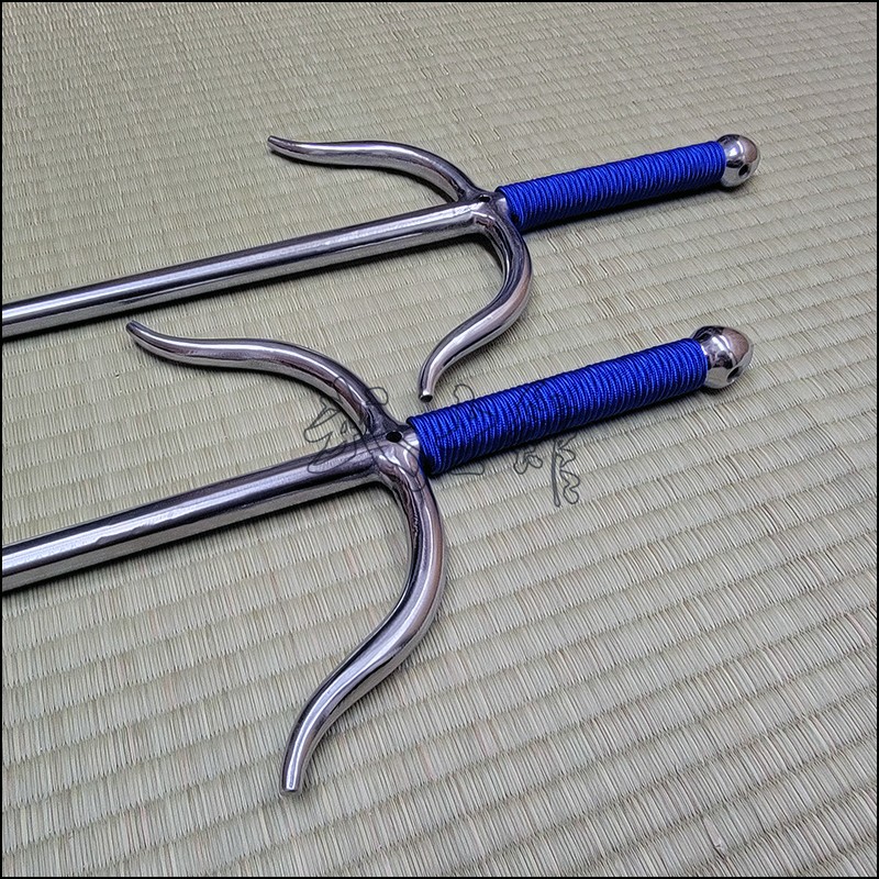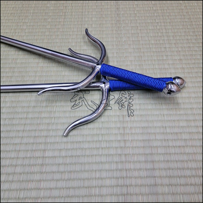 Sai 7 – Bushikan Chinese Sai (Tai) specially crafted for the Won Hop Loong Chuan martial arts organization with polished finish and blue cord made from stainless steel. This Sai model is characterized by its very special guards (yoku), rounded blade (monouchi) and pointed back (tsukagashira). Sai-7 is sold in sets of 2 (pair of Sai).