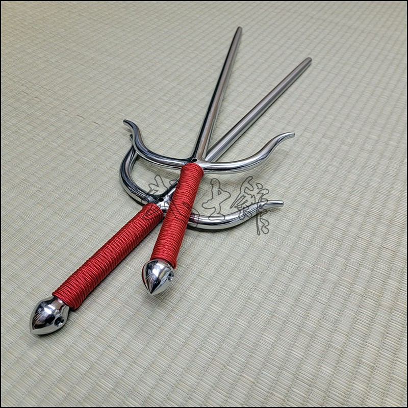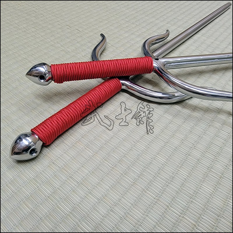Sai 7 – Bushikan Chinese Sai (Tai) specially crafted for the Won Hop Loong Chuan martial arts organization with polished finish and red cord made from stainless steel. This Sai model is characterized by its very special guards (yoku), rounded blade (monouchi) and pointed back (tsukagashira). Sai-7 is sold in sets of 2 (pair of Sai).
