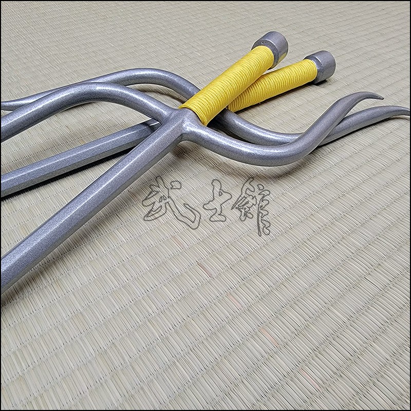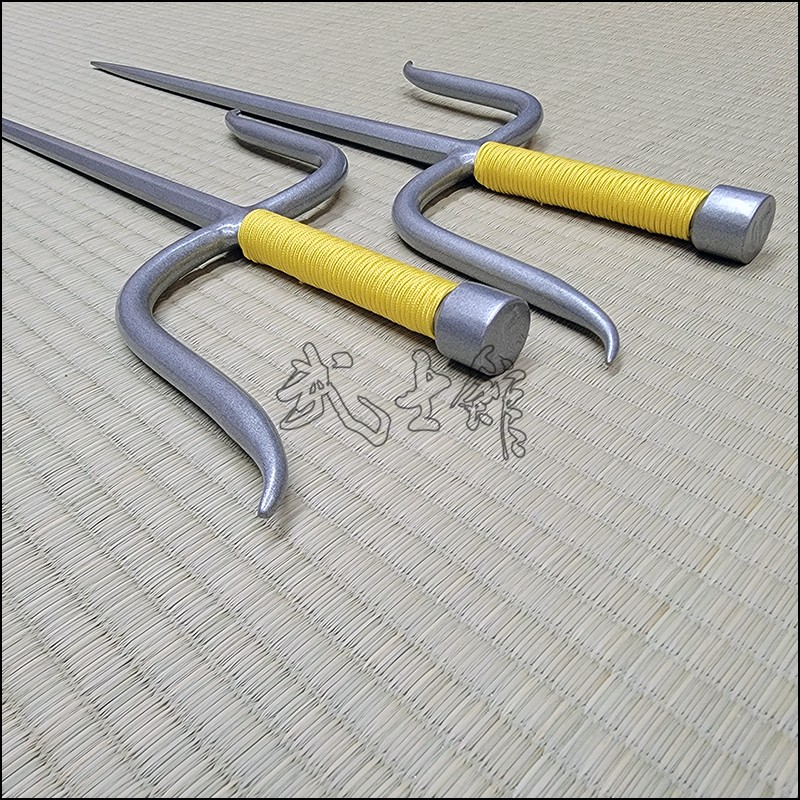 Sai 8 – Matayoshi Kobudo Sai with silver finish and yellow cord made from wrought iron. This specially designed Sai is a weapon practiced in Matayoshi Kobudo. This Sai model is characterized by having an octagonal blade (monouchi) and flat back (tsukagashira).
